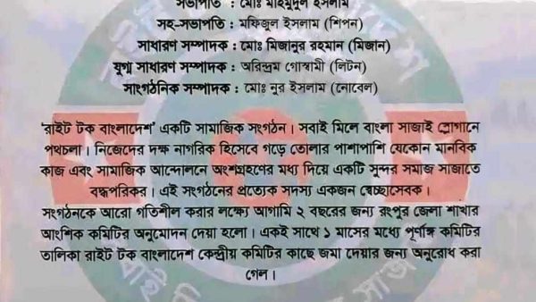 রাইট টক বাংলাদেশ এর রংপুর জেলা কমিটির অনুমোদন