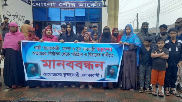 মোংলায় নারী পাচারকারী, মাদক ও সুদ কারবারীর নানা অপকর্মের হাত থেকে পরিত্রাণ পেতে এবং বিচারের দাবীতে মানববন্ধন
