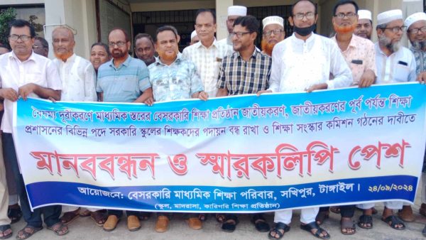 সখিপুরে মাধ্যমিক শিক্ষা প্রতিষ্ঠান জাতীয়করণের দাবিতে মানববন্ধন ও স্মারকলিপি
