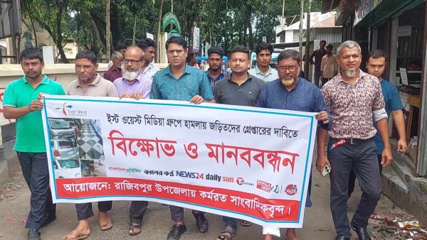 রাজিবপুরে বৃষ্টি উপেক্ষা করে ইস্ট ওয়েস্ট মিডিয়া গ্রুপের হামলার প্রতিবাদে মানববন্ধন ও বিক্ষোভ