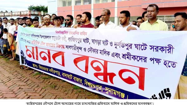 সুুনামগঞ্জের তাহিরপুরের নদীপথে অতিরিক্ত টোল আদায়ের প্রতিবাদে মানববন্ধন
