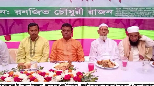 বিশ্বম্ভরপুর উপজেলা পরিষদ নির্বাচনে চেয়ারম্যান পদপ্রার্থী রনজিৎ চৌধুরী উদ্যোগে ফতেপুর গ্রামে ইফতার ও দোয়া মাহফিল