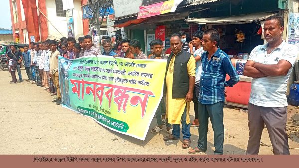 দিরাইয়ের তাড়ল ইউপি সদস্য বাবুল দাসের উপর সন্ত্রাসী হামলার ঘটনায় জড়িতদের গ্রেপ্তার করে শাস্তির দাবীতে মানববন্ধন
