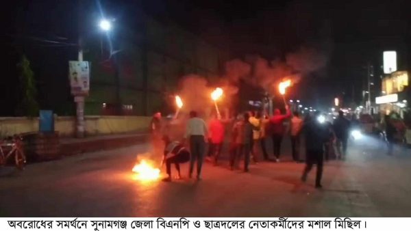 আগামী দু”দিনব্যাপী ৪৮ ঘন্টার অবরোধ কর্মসূচী সফল করতে সুনামগঞ্জ জেলা বিএনপি ও ছাত্রদলের মশাল মিছিল