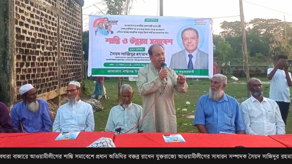 বিএনপি জামায়াতের নৈরাজ্যের প্রতিবাদে শান্তিগঞ্জের জীবধারা বাজারে শান্তি সমাবেশে নৌকার মনোনয়ন প্রত্যাশী সৈয়দ সাজিদুর রহমান