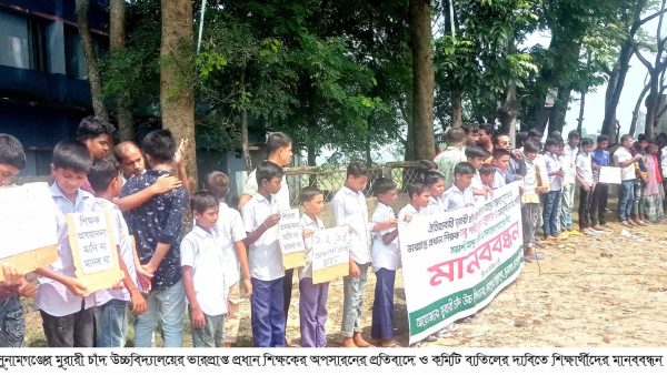 মুরারি চাঁদ উচ্চ-বিদ্যালয়ের ভারপ্রাপ্ত প্রধান শিক্ষককে অপসারনের প্রতিবাদে ও কমিটি বাতিলের দাবিতে শিক্ষার্থীদের মানববন্ধন