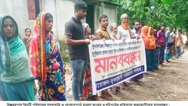 বিশ্বম্ভরপুরের পূর্বকাপনা গ্রামে তিনটি পরিবারের বসতবাড়ি,দোকানপাঠে র্দুবৃত্তদের হামলাও লুটপাঠের ঘটনায় দোষীদের গ্রেফতারের দাবীতে মানববন্ধন