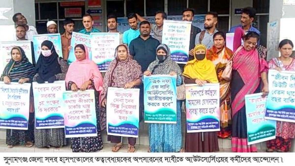 সুনামগঞ্জ হাসপাতালে দূর্নীতিবাজ তত্বাবধায়কের অপসারণের দাবিতে আউটসোর্সিং কর্মীদের তৃতীয়দিনের মতো কর্মসূচি চলছে