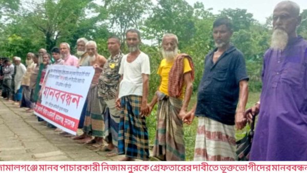 জামালগঞ্জে বিদেশে লোক পাঠানোর নামে প্রতারক নিজাম নুরের বিরুদ্ধে ৫ লাখ টাকা আত্মসাতের ঘটনায় তার গ্রেপ্তার ও শাস্তির দাবীতে মানববন্ধন