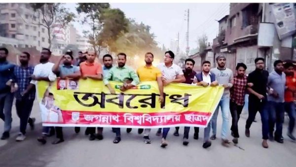 অবরোধে জবি ছাত্রদলের বিক্ষোভ মিছিল